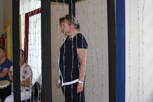 Das Bühnenbild besteht aus einem Kasten, in dem eine Person bequem drin stehen kann. Der Kasten besteht aus mehreren Holzrahmen, die innen mit jeweils 8 Stacheldrahtsträngen versehen sind, die von oben nach unten gezogen wurden. Dadurch dass nur 8 locker angebrachte Drähte gewählt worden sind, sind die Abstände groß genug. Es entsteht damit das Gefühl, noch gut dazwischen raus schlüpfen zu können. Weiterhin gibt es 3 Stellwände in gleicher Art mit 8 Drähten. Der Kasten trägt die Farbe Schwarz, die Stellwände sind in den Farben Gelb, Rot, Blau gehalten. Die Grundfarben symbolisieren die Möglichkeit, jeden Farbton mischen zu können. Nur manchmal fehlt uns im Leben das Rot oder etwas vom Blau oder Gelb, und wir stehen vor Grenzen und schaffen es nicht, den Farbton zu mischen, den wir uns wünschen.