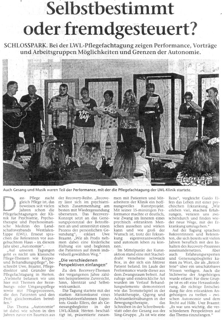 Auf die Idee der Performance "Aufenthalt" kam ich durch einen Text, den eine Patientin in der von Genesungsbegleitern geleiteten Gruppe "Wortfabrik" geschrieben hatte und der sich mit dem Thema der diesjährigen Hertener Pflegefachtagung "Autonomie" befasst. Die Patientin beschreibt in diesem Text Eindrücke ihres Aufenthaltes.
